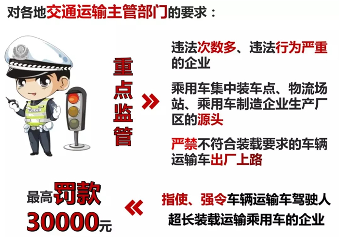 各乘用车制造企业要加强对本企业乘用车装车点的管理,使用符合国家标准要求的车辆运输车合规装载运输(示意图见附件2),并利用信息化手段,加强对乘用车在途运输管理,严禁超长装载运输;要合理制定乘用车运输合同和价格,抵制整车物流企业明显低于运输成本价格的恶意投标行为。各地交通运输主管部门要加强对本辖区整车物流企业的监督检查,督促辖区内整车物流企业合法装载运输,对违法次数多、违法行为严重的企业要进行重点监管;要强化对乘用车集中装车点、物流场站、乘用车制造企业生产厂区的源头监管,严禁不符合装载要求的车辆运输车出厂上路;对于指使、强令车辆运输车驾驶人超长装载运输乘用车的,要按照《公路安全保护条例》相关规定,依法责令改正,处三万元以下的罚款。