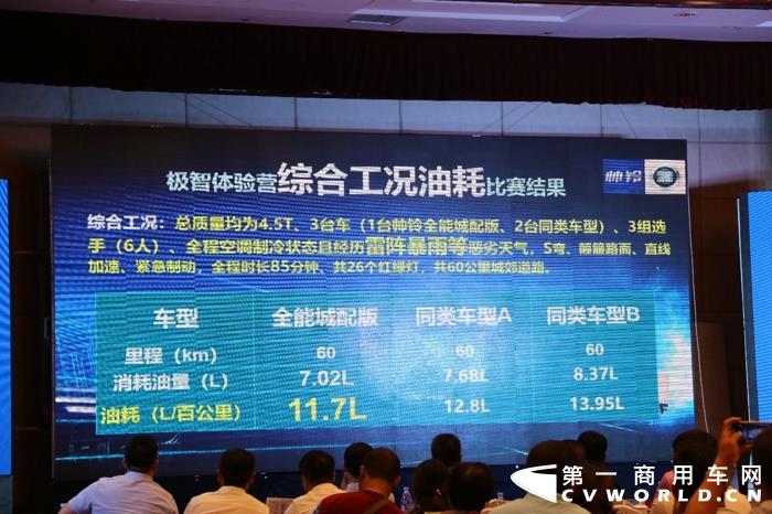 经过赛后统计,帅铃全能城配版的油耗为百公里11.7L,其余两款竞品车型的油耗为12.8L和13.95L,优势明显。